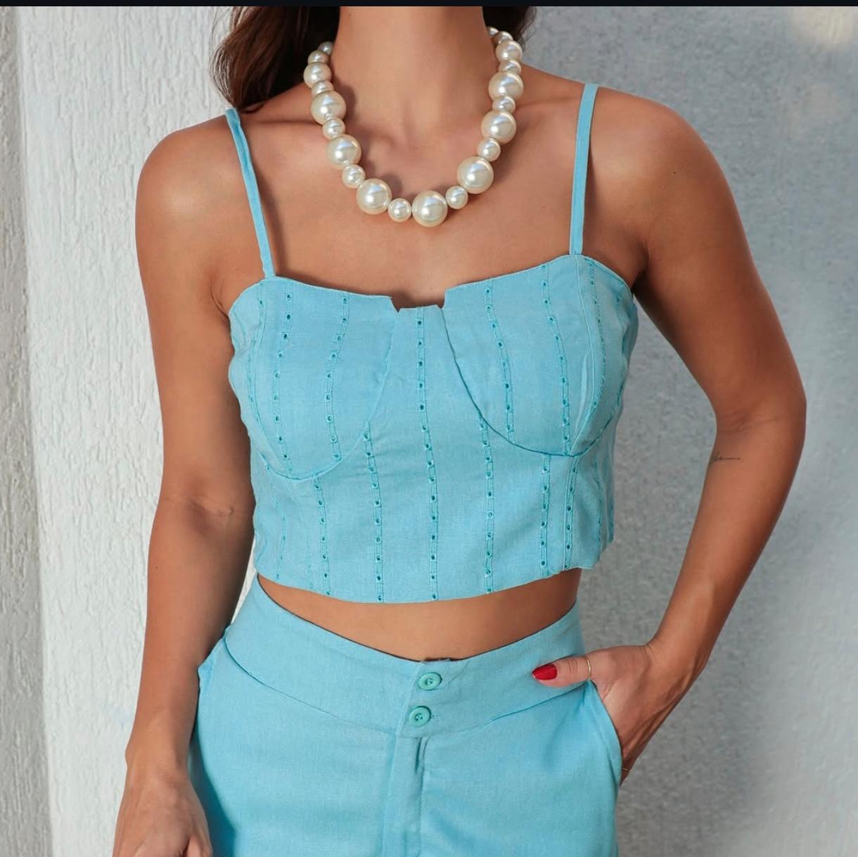 Conjunto moderno e sofisticado composto por cropped estruturado de alças finas e detalhe de recortes sutis, combinado com short de cintura alta em tom bege clássico. A proposta traz leveza e elegância, perfeita para dias quentes, unindo conforto e estilo. O look é complementado com acessórios transparentes, como colar e pulseiras, além de uma bolsa branca que reforça o ar clean e contemporâneo da produção. Ideal para ocasiões casuais com um toque de sofisticação.
