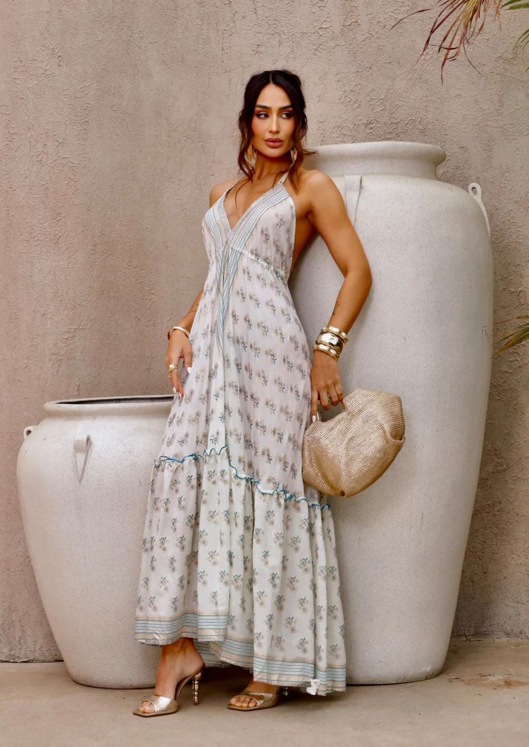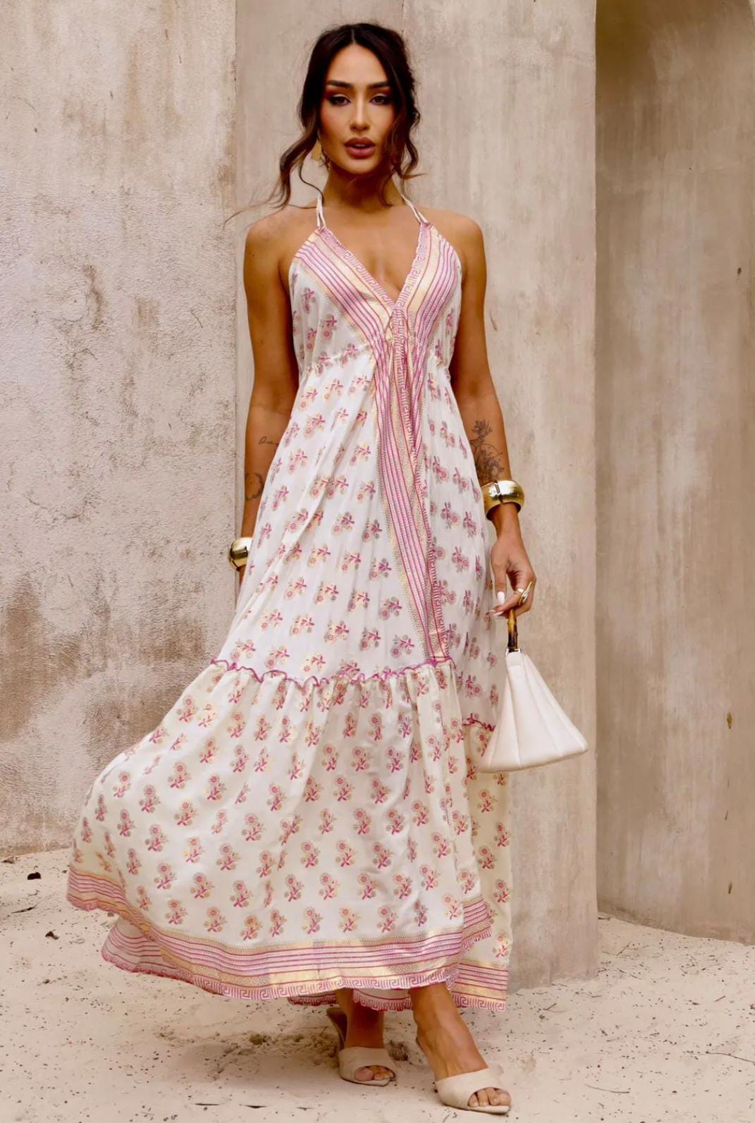 Vestido Longo Estampado Decote V na Frente e Nas Costas